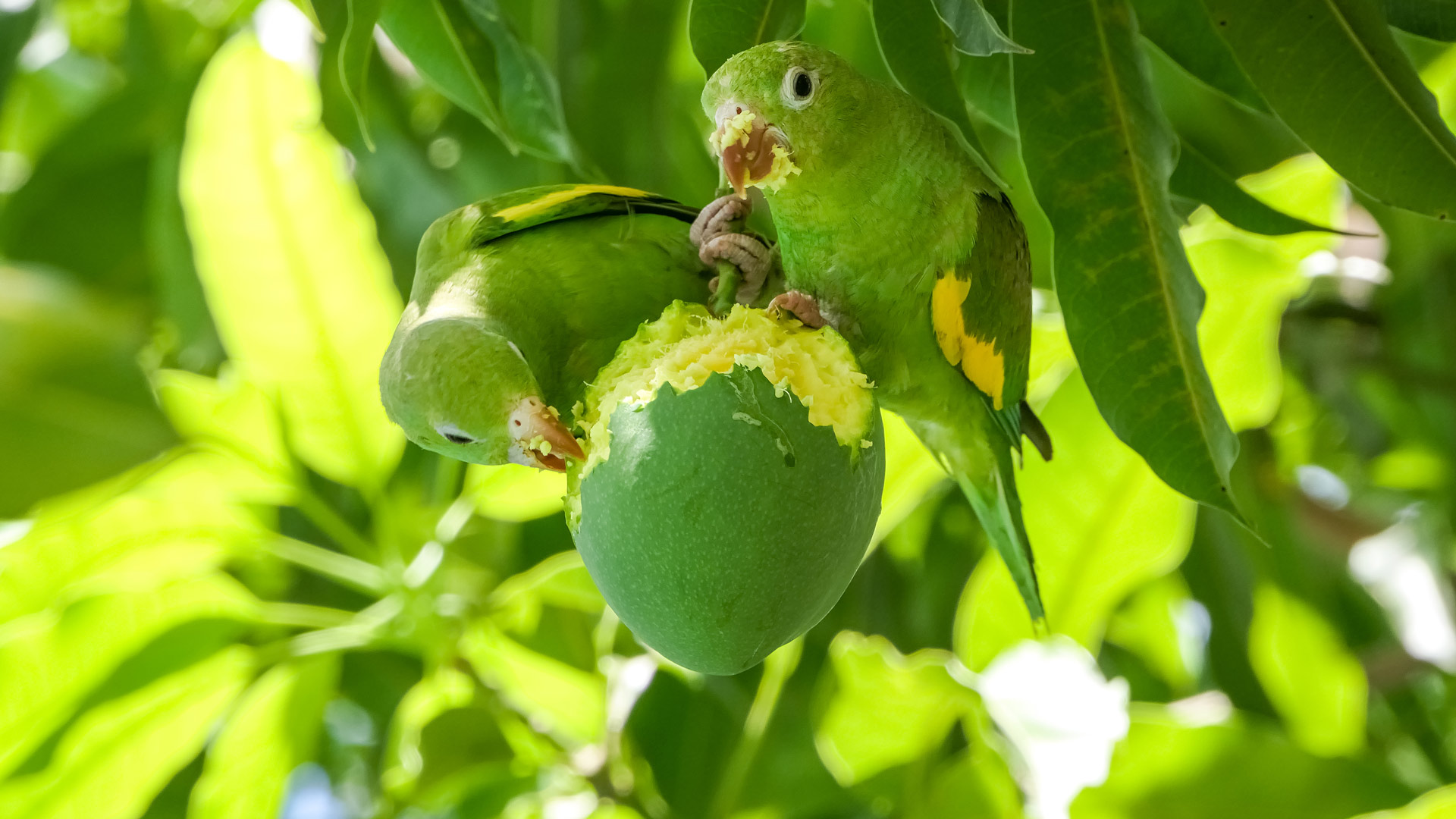 Yellow-chevroned parakeets in a mango tree, Pantanal, Brazil (© Uwe-Bergwitz/Getty Images)